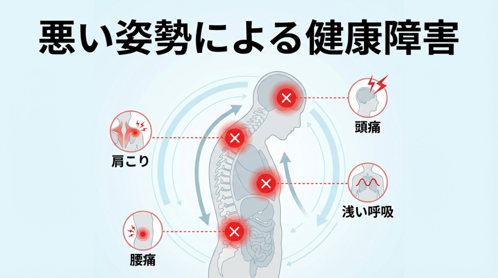姿勢の悪さは、見た目の問題だけではありません。健康にも深刻な悪影響があります。