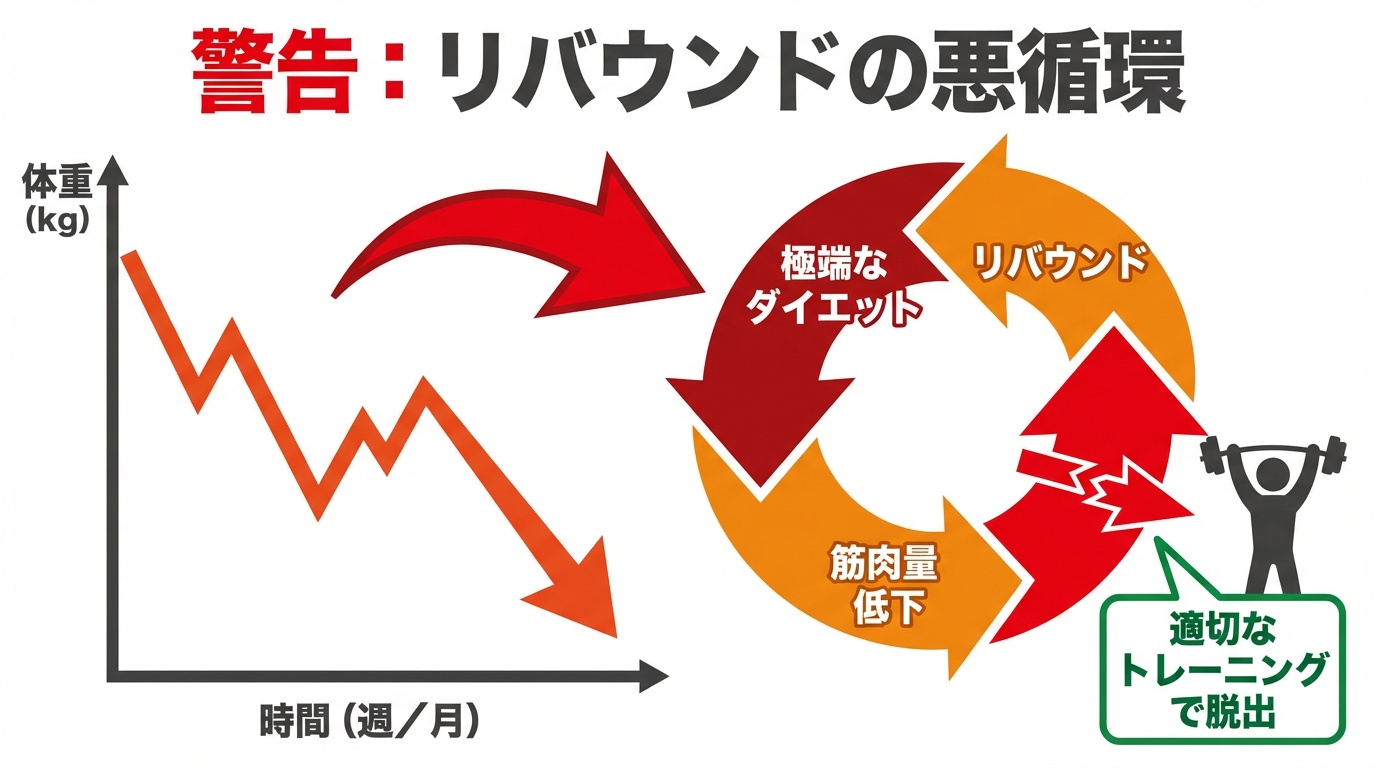 急激に痩せると、筋肉も一緒に減ってしまい、リバウンドのリスクが高まります。